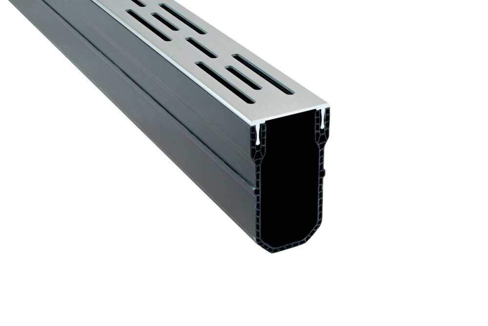 Luxury Drain watergoot 65-100 aluminium grijs 100 cm is een PVC afvoergoot met een aluminium designrooster voor niet-verkeersbelaste gebieden rondom woningen. Water kan worden afgevoerd naar het riool